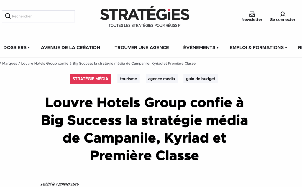C’est une annonce qui marque un tournant pour notre pôle média : Louvre Hotels Group nous confie l’intégralité de sa stratégie pour les enseignes Campanile, Kyriad et Première Classe.