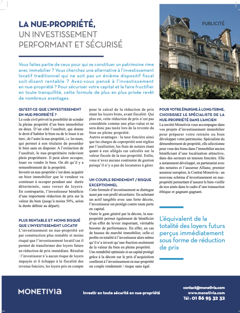 Nous orchestrons chaque année une campagne presse avec des titres puissants : Figaro, Capital, Paris Match…Afin de toucher tant les acheteurs que vendeurs pour promouvoir : le Contrat Monétivia.